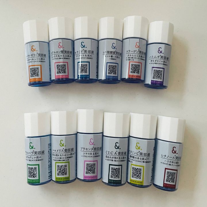 こちらが新作の美容液です。何と12種類もあります。パッケージに表記された美容成分はどれも聞いたことがある名前ばかりで、思わずテンションが上がってコンプリートしてしまいました。