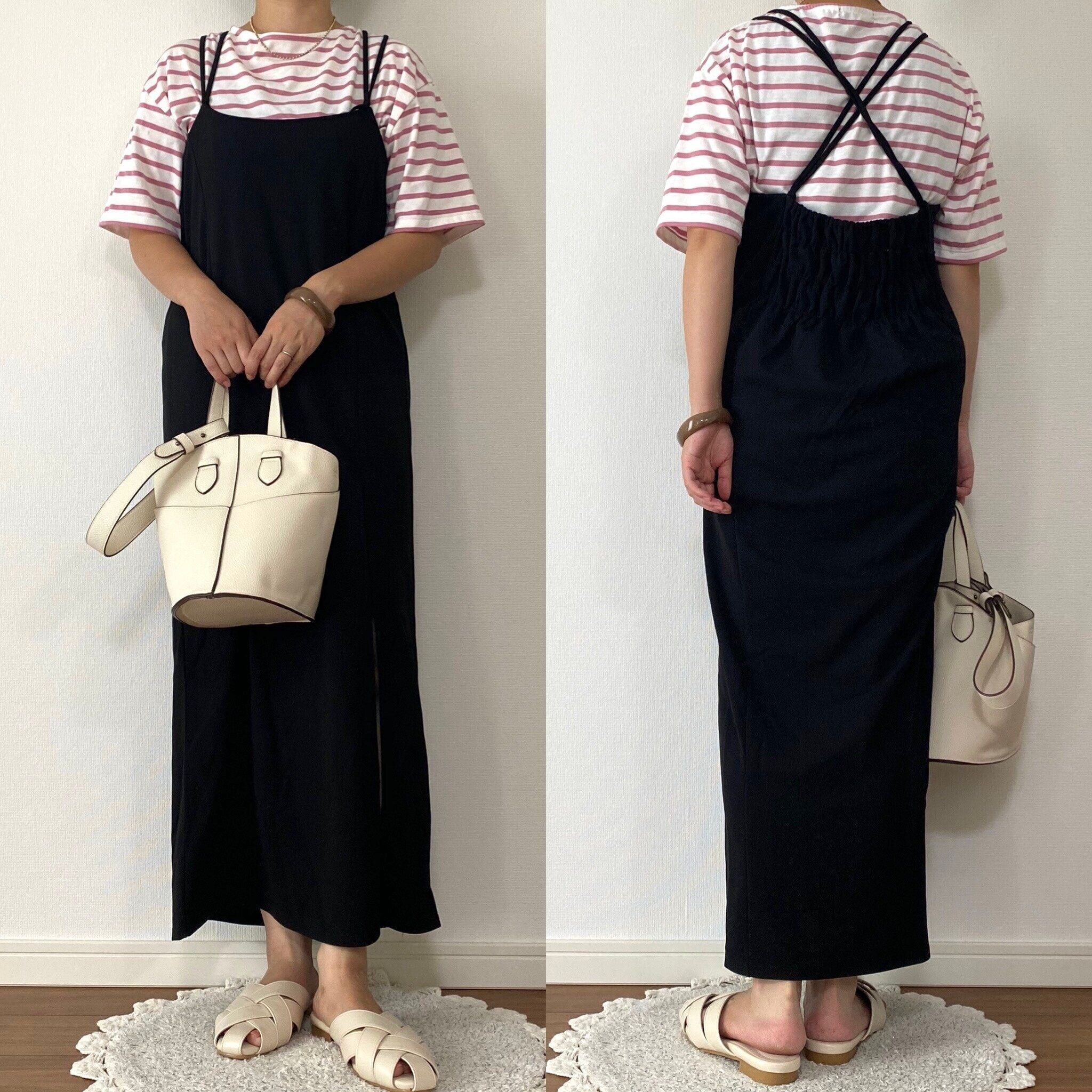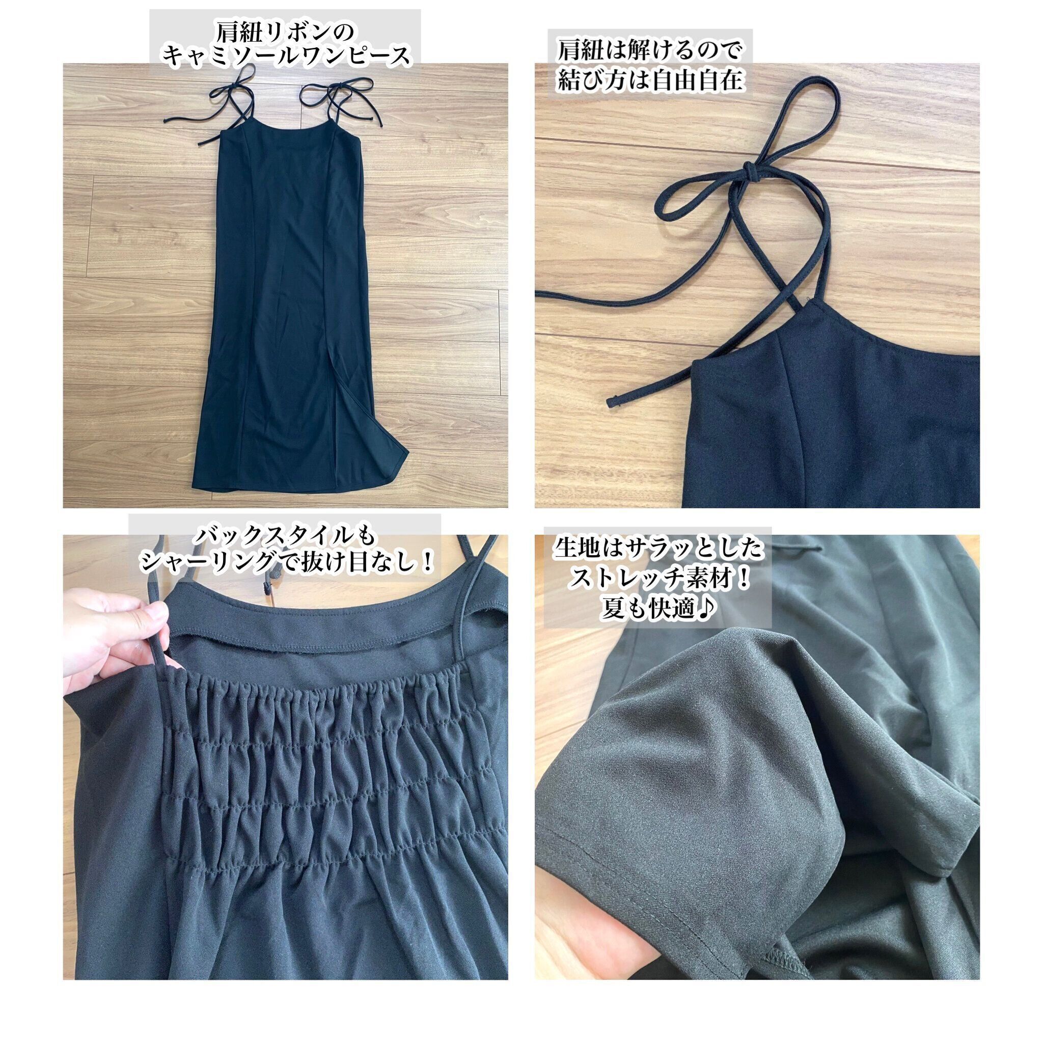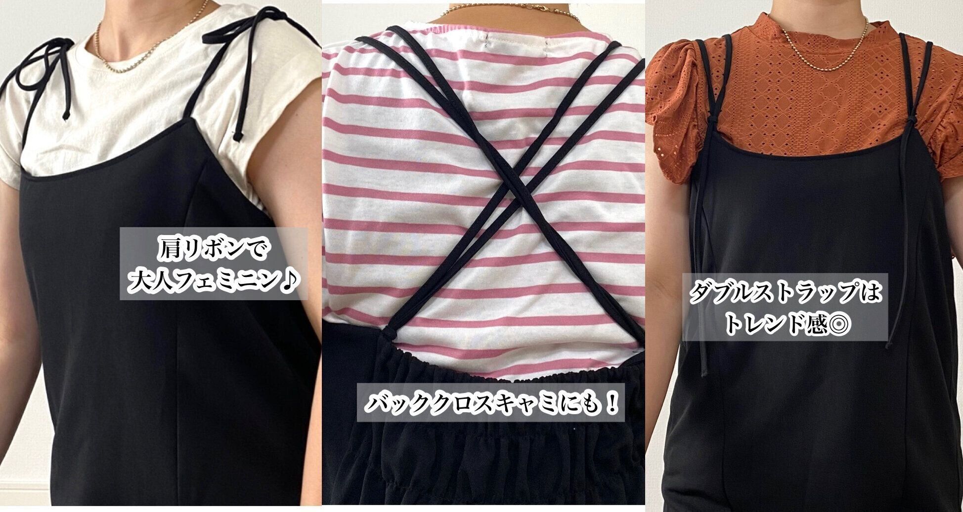 子どもっぽくなりがちなキャミソールワンピースも、全体をモノトーンで統一すると大人っぽい印象に。左は肩紐をリボン結びで、右は今トレンドのダブルストラップにしてトレンド感をアップ!