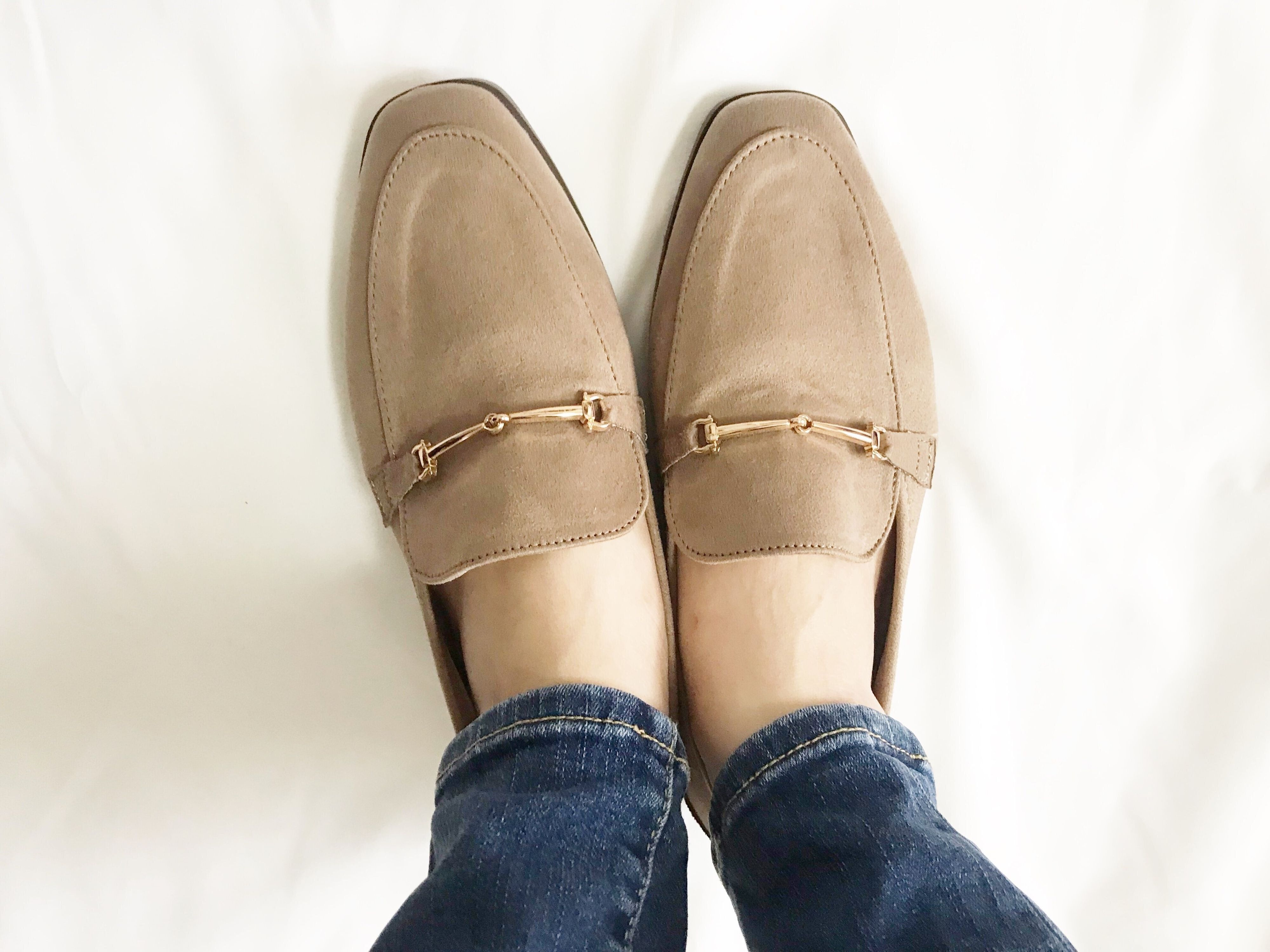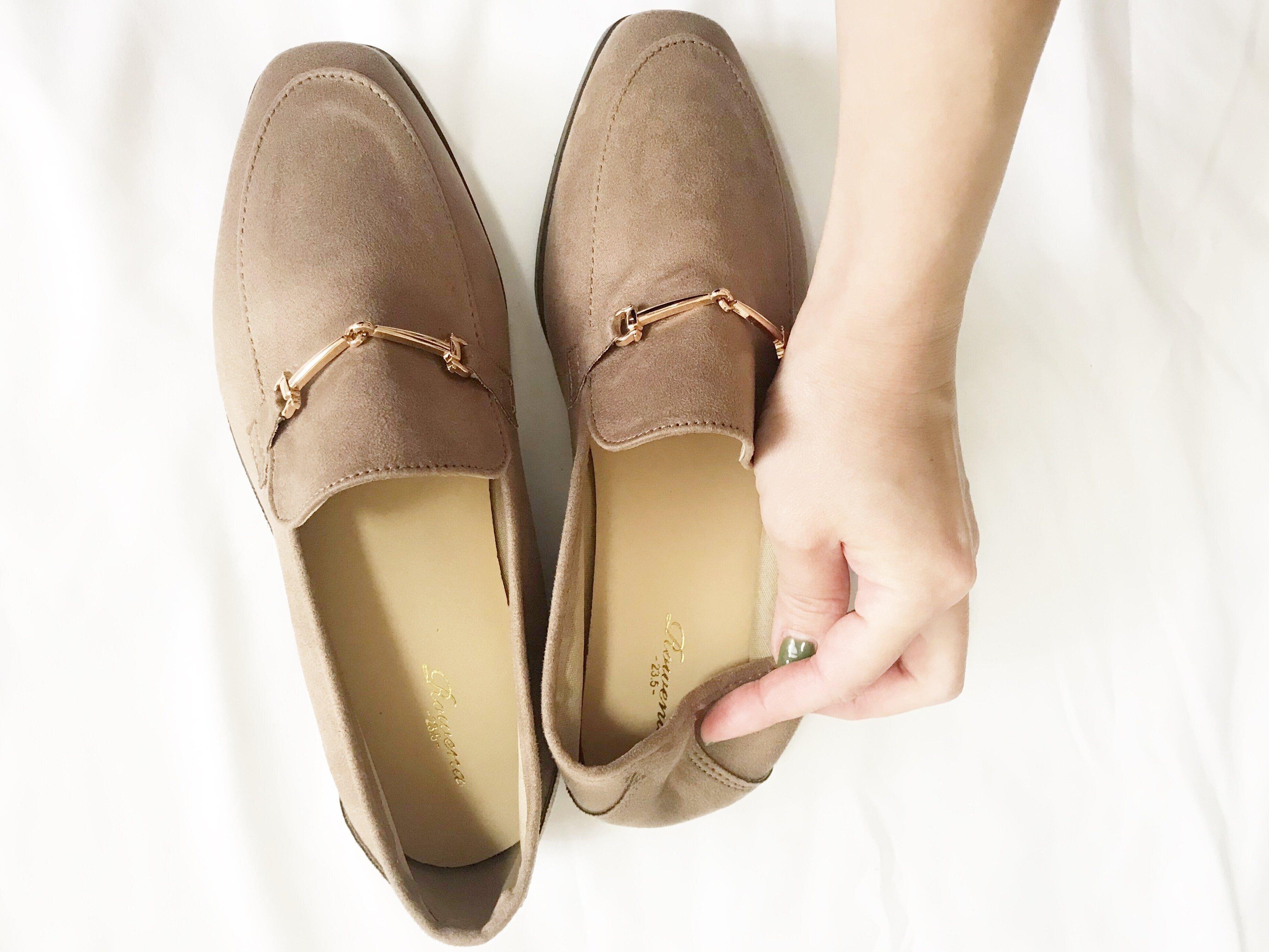 「レディースビット付ローファー」(1,518円)は、数ある「靴のヒラキ」のアイテムの中でも特におすすめのローファー。一番のおすすめのポイントは1,518円というスペシャルプライス! セールではなくプロパーでこのプライスなのは衝撃です。カラー展開はレザー調のブラック・クロコ調のグレーベージュとブラック・そして筆者が購入したスエード調のオークの4種類です。
