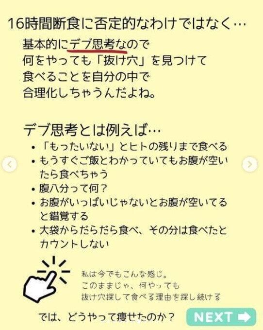 なかなか落ちない体重。その原因として、みずから「デブ思考があったから」と分析します。mii_keto_165さんの言う「デブ思考」とは、「もったいない、と人の残りまで食べてしまう」「自分の腹八分目がわからない」「お腹がいっぱいでないと、お腹がすいていると錯覚してしまう」など、つい自分に都合のよいように解釈をして、食べすぎてしまう思考のこと。これは思い当たる人も多いのでは?
