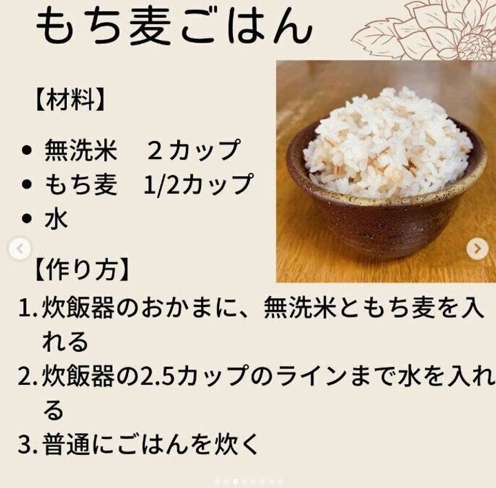 「ダイエットは毎日無理せずコツコツと。でもおいしいものも食べたい」と言うbmajo_diet_rooさんもおすすめするのが、「もち麦ご飯」です。血糖値の上昇が穏やかになり、食物繊維もたっぷりのもち麦ご飯。炊飯器で炊くだけなので、取り入れやすいですよね。