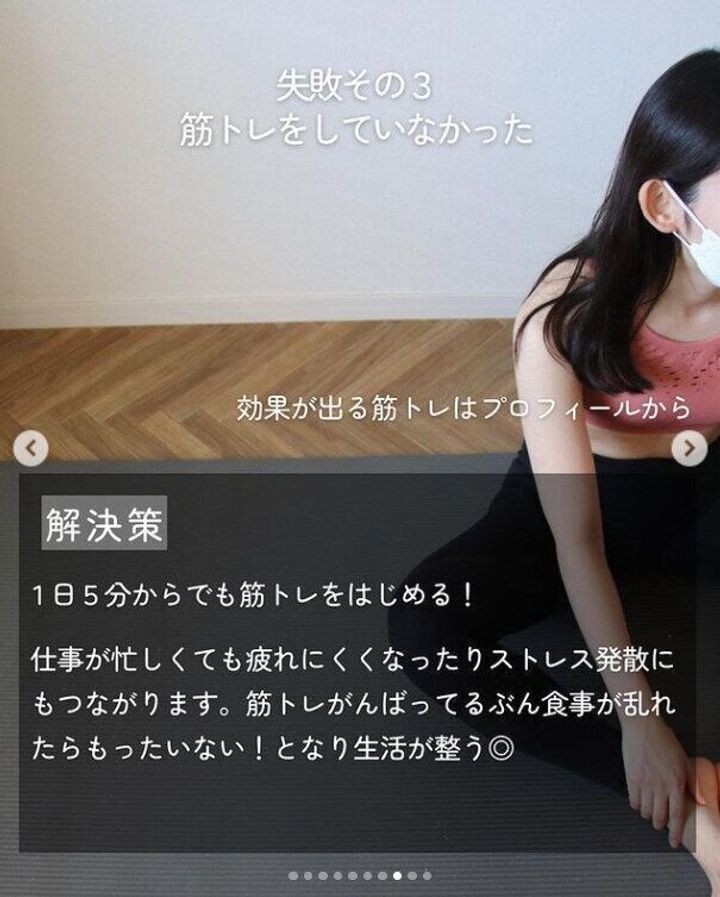 当初は、運動が苦手だったこともあり、ダイエットに取り入れていませんでした。でも、筋肉が落ちるとリバウンドの原因になると知り、思い切って取り入れてみることに。1日5分から自宅で筋トレを始めてみました。習慣化してくると、仕事でいそがしくても疲れにくくなったり、ストレス発散にもつながったと言います。「筋トレをがんばっているのだから、食事が乱れるのはもったいない!」と感じるようになり、自然と食生活が整うことにもつながりました。