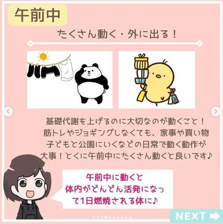 kurosanmy_paceさんもいわく、産後ママにとっては、運動や筋トレなどを持続的に行うのは時間的にも体力的にもむずかしい。だからこそ、日々の生活を見直せばいい言います。何気ない日常にもダイエットのチャンスはたくさんあるのです。「痩せるママの1日」をご紹介しましょう。