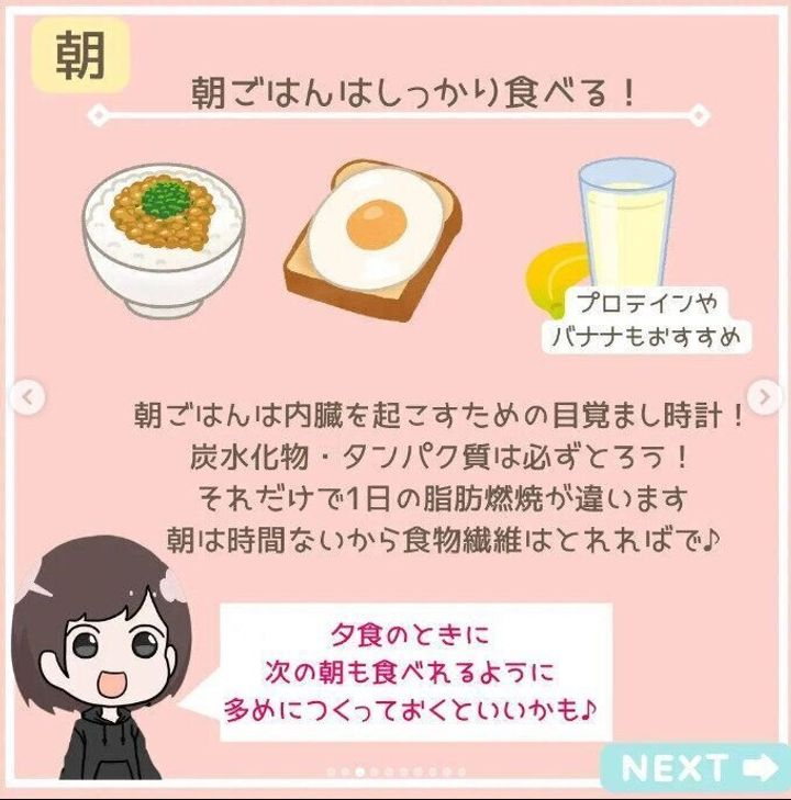 朝ごはんをきちんと食べることで1日の脂肪燃焼が違うと言います。炭水化物、タンパク質を必ずとりましょう。そうはいってもなかなか朝からごはんをつくる時間が取れないということも。夕食のときに次の朝も食べられるようにつくっておくのがおすすめなのだそう。