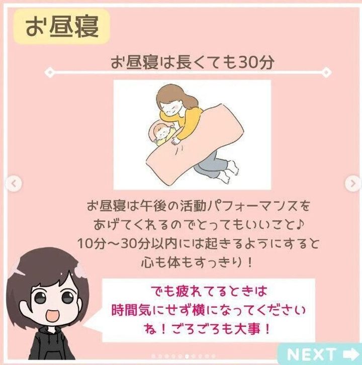 お昼寝は午後のパフォーマンスをあげてくれるのでおすすめ。子どもと一緒にお昼寝をしてみるのもいいですね。10分~30分以内には起きるようにすれば、心も体もすっきりです。