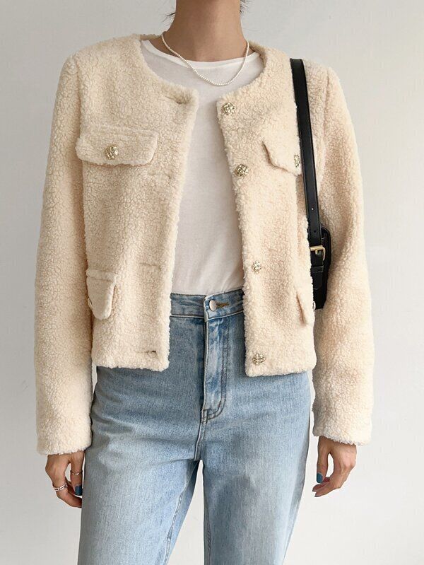 金のフロントボタンがアクセントになっているボアブルゾン。オフィスコーデなどとしても活躍できる1枚ですが、あえてジーンズと合わせてカジュアル風に着こなすのもおすすめ。丈も短めなので、脚長効果もありそう。