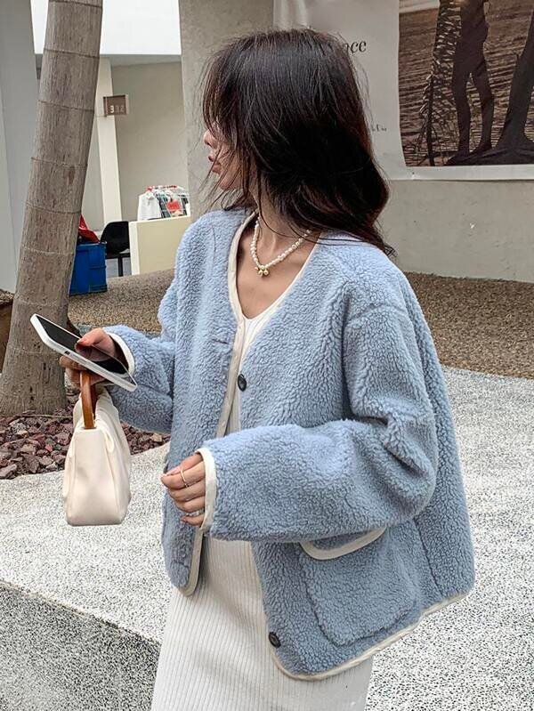 淡いブルーが上品な印象のボアブルゾン。フロントの黒いボタンがアクセントです。カジュアルになりがちなボアブルゾンですが、ワンピースの上に羽織るだけで少しくずしたきれいめコーデの完成です。