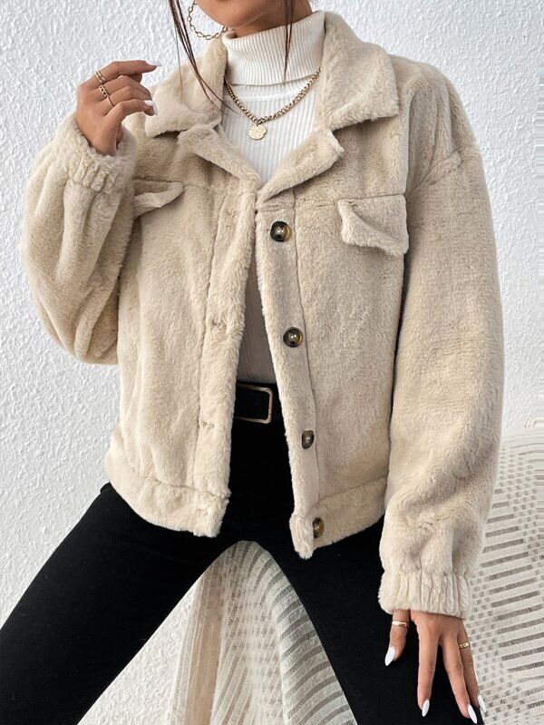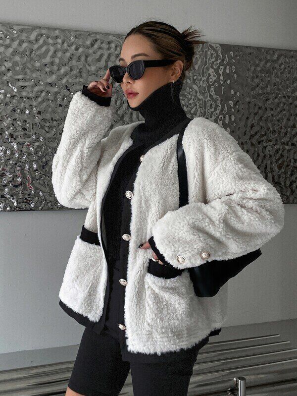 黒いラインとフロントのボタンがアクセントになっているボアブルゾン。ドロップショルダーなのでゆったりと着ることが可能。黒いタートルネックなどと合わせれば、シンプルですがすっきりとしたきれいめコーデに仕上がります。