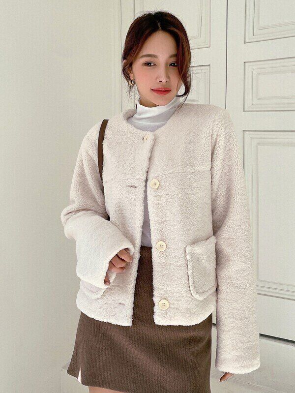 フロントボタンがアクセントの白いボアブルゾン。ポケットも2つついて、かわいらしいデザインです。スカートやタートルネックと合わせればきれいめコーデも完成。通勤コーデにもおすすめです。