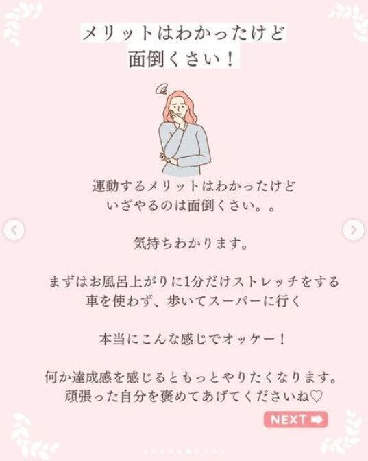 運動が苦手だからとなかなか取り入れることができない?momo.koriitamikaizendietさんのSNSには、だれでも簡単にできるストレッチなどもたくさんアップされています。まずは習慣化することから。ぜひ参考にしてみてくださいね。