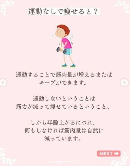 運動をせずに痩せたということ、それは筋力が減って痩せたということ。何もしなければ筋肉量は自然と減ってしまいます。運動をすることで筋肉量をキープすることができるのです。