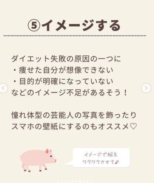 ダイエットが失敗する原因として、「痩せた自分が想像できない」「目的が明確になっていない」などのイメージ不足があるのだとか。たとえば、憧れる体形をもつ芸能人の写真を飾ってみたり、スマホの壁紙にしてみたりするのもおすすめなのだそう。きれいに痩せた自分の姿をイメージして、脳をワクワクさせるといいのだそうですよ。
