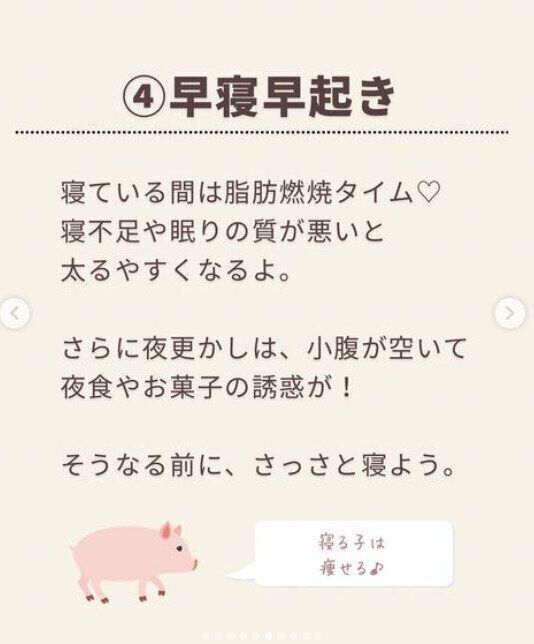 次のポイントは、「早寝早起き」です。じつは、寝ているあいだというのは、脂肪燃焼タイムとも言われているのだそう。寝不足や眠りの質が悪いと太りやすくなってしまうと言われています。また、夜更かしをすれば、小腹がすいて夜食やお菓子を食べてしまう誘惑も。そうなる前にさっさと寝てしまいましょう!