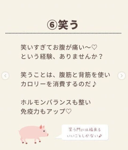 笑いすぎてお腹がいたい!という経験はだれにもありますよね。笑うことは腹筋と背筋をつかい、カロリーを消費してくれます。また、ホルモンバランスも整い、免疫力もアップさせてくれるのだとか。「笑って心も体もすっきり!」ですね。