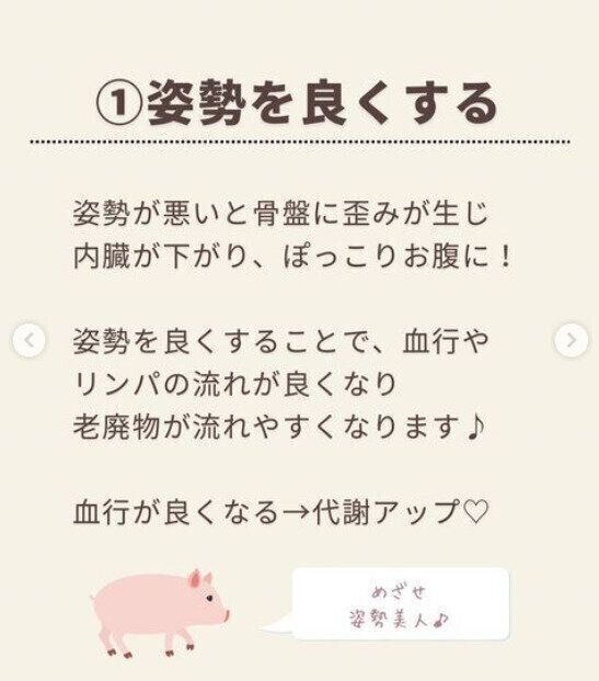 まずは、「姿勢を正すこと」です。姿勢が悪いと骨盤にゆがみが生じて内臓が下がり、ぽっこりお腹に。姿勢をよくすることで血行やリンパの流れがよくなり、老廃物が流れやすくなるのです。そして血行がよくなることで代謝はアップ!姿勢美人をめざしていきましょう。