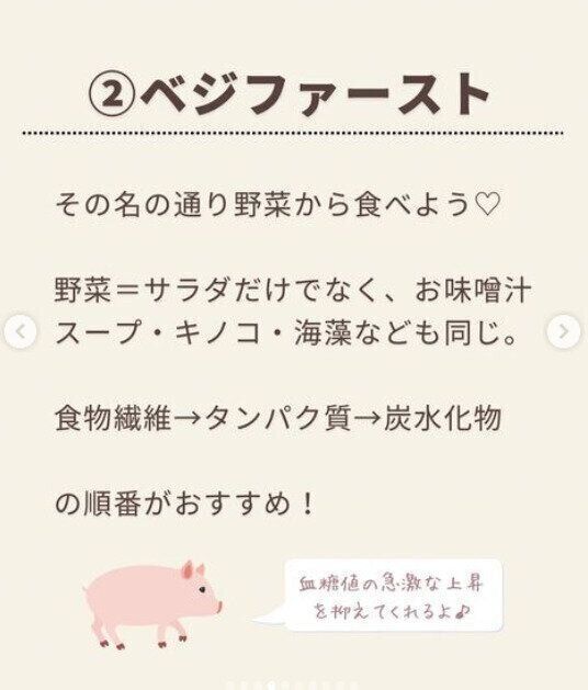 「食べるときはべジファースト」。食事のときは、まずは野菜から食べることを心がけてみましょう。ちなみに、野菜とは「サラダ」のことだけではなく、お味噌汁、スープ、キノコや海藻などもOKです。食べる順番を、食物繊維→タンパク質→炭水化物で食べていくのがおすすめ。食べる順番を意識するだけで、血糖値の急激な上昇を抑えてくれます。