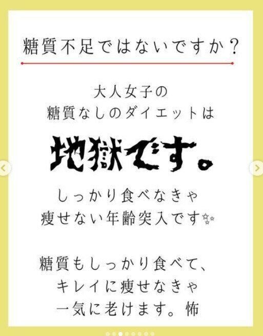 糖質を極端に減らすダイエットもありますが、diet_lily_kawasakiさんいわく、大人のダイエットには糖質が必要。栄養バランスを考えた食事をしっかりとることが大切だと言います。糖質が不足すると一気に老けてしまう原因にもなるのだとか!