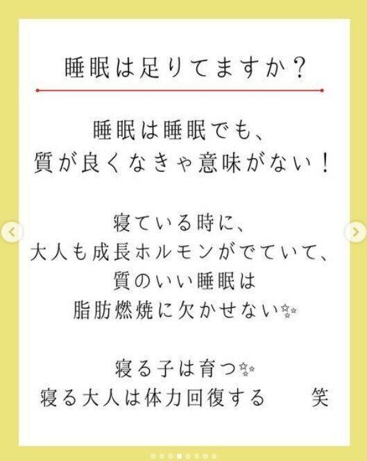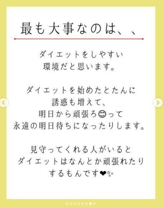 ある程度の年齢を迎えると、若いころのように無茶なダイエットで減量をすることは体の健康を損ないます。diet_lily_kawasakiさんが伝えているのは、栄養バランスのとれた食事を心がけ、しっかりと睡眠をとり体を休める。ダイエットの環境を整えてストレスをためないなど、心身ともに健康的な生活に改善していくことがダイエットの最優先事項だということなのです。