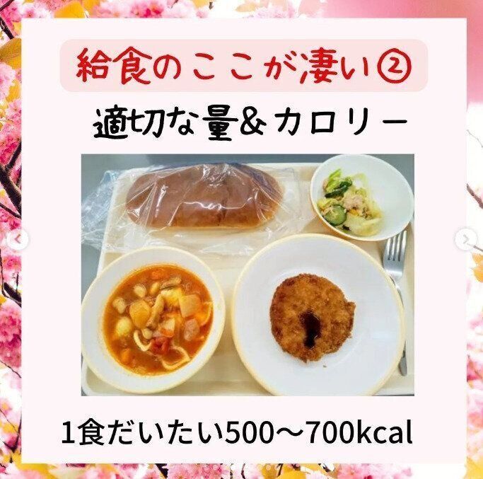1食、だいたい500~700kcalで計算されており、適切な量とカロリーをとることができるのだそう。