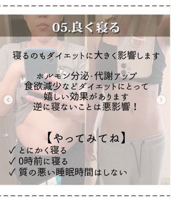 「よく寝る」ということもダイエットには大切。ホルモン分泌、代謝アップ、食欲減少などダイエットにうれしいことがいっぱいあるのだそう。質のよい睡眠時間もポイントなのだそうですよ。