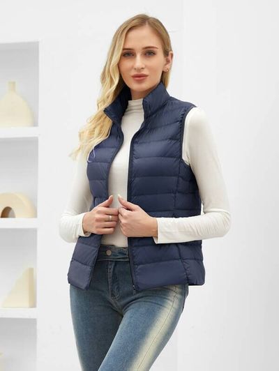 シンプルで着回し力抜群のネイビーブルーのジッパーアップダウンベスト。軽くて薄手の生地なので、インナーベストとしても着ることができます。ジーンズと合わせるカジュアルコーデもおすすめです。