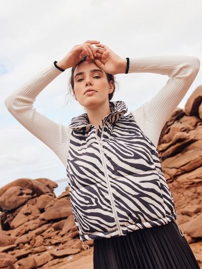ゼブラ柄がワイルドな印象のインナーダウンにもなるダウンベスト。アニマル柄は、シンプルなトップスとボトムスと合わせるのがおすすめ。白や黒でモノトーンコーデにするのがよいでしょう。