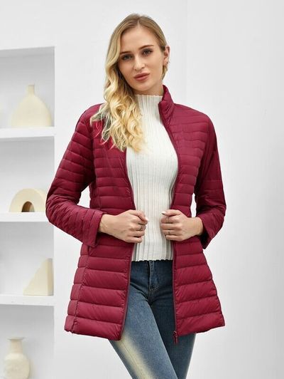 ブルゴーニュカラーがおしゃれなジッパーアップダウンコート。薄手のダウンコートなので、インナーダウンとして着ることも可能。白いシンプルなタートルネックやジーンズと合わせれば、ブルゴーニュの個性的なカラーが引き立ちますね。