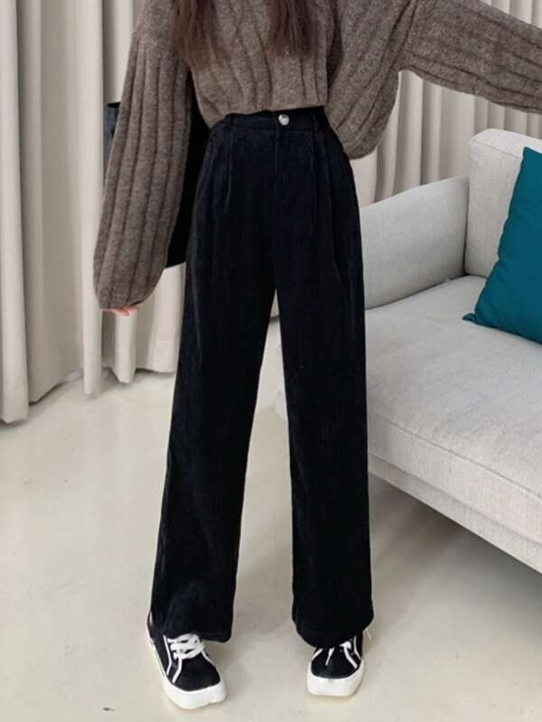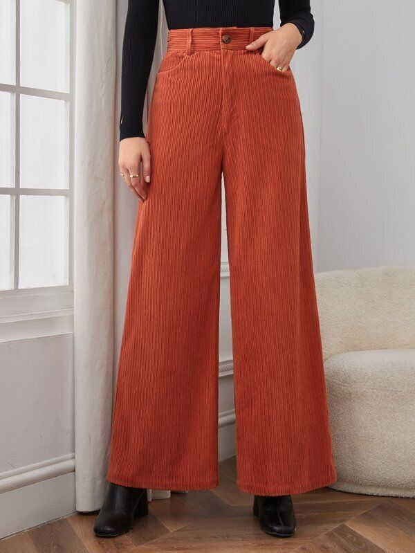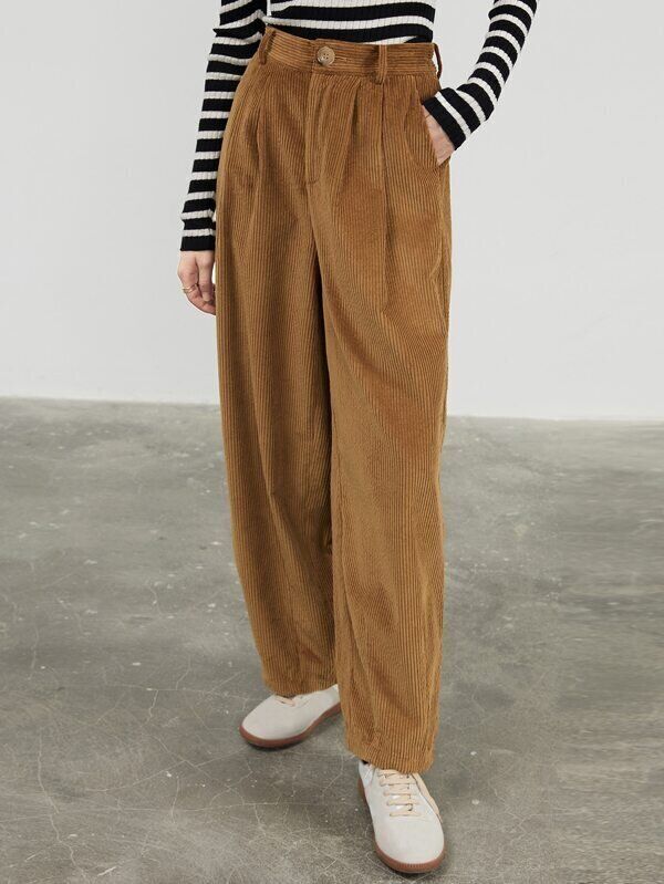 ハイウエストのコーデュロイパンツは脚長効果もあり!