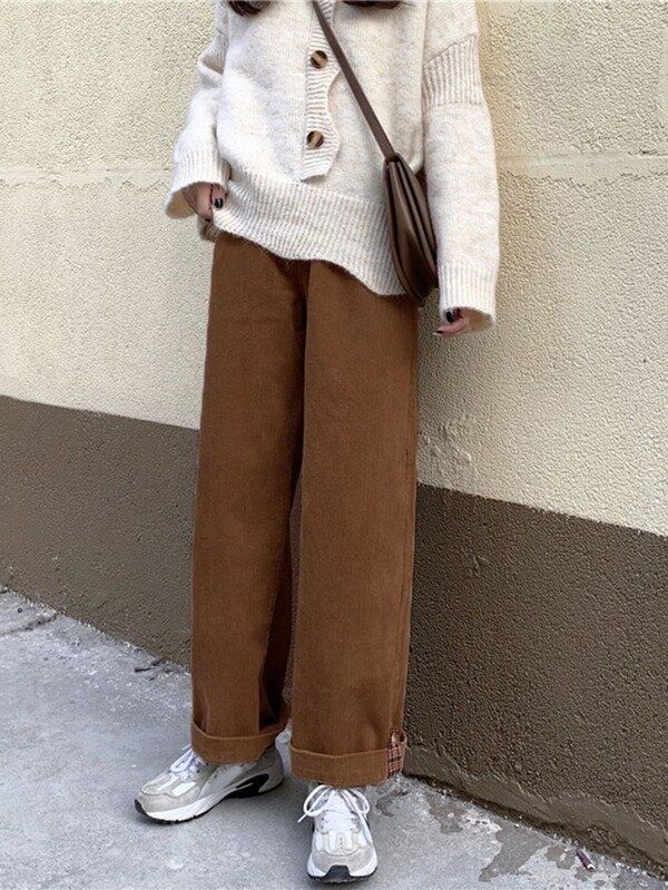 秋冬コーデに大活躍のコーデュロイパンツ。冬はあたたかいセーターと合わせるのがおすすめです。茶色のコーデュロイパンツなら、白いセーターとの相性もバッチリですね。