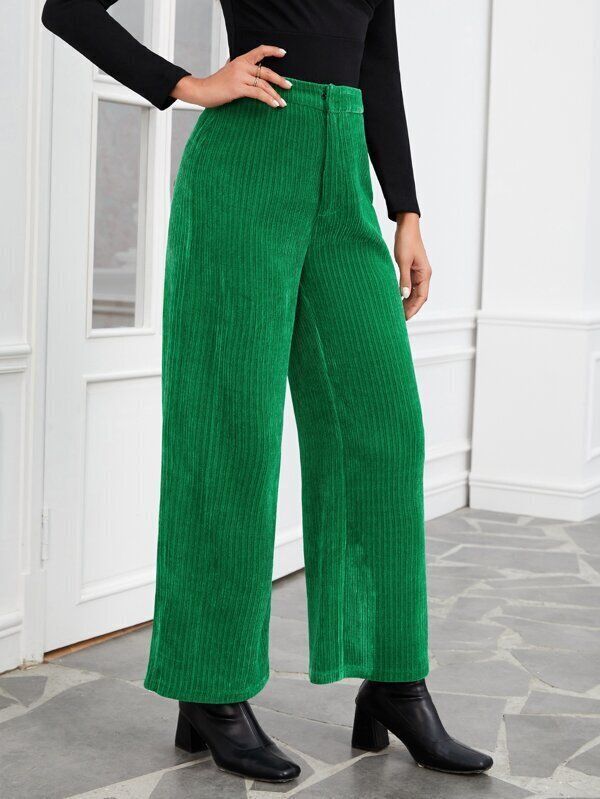 鮮やかなグリーンのコーデュロイパンツ。黒いトップスや黒いブーツと合わせると全体が引き締まって見えます。ハイウエストのパンツは脚長効果も期待できるので、トップスはインするのがよいでしょう。