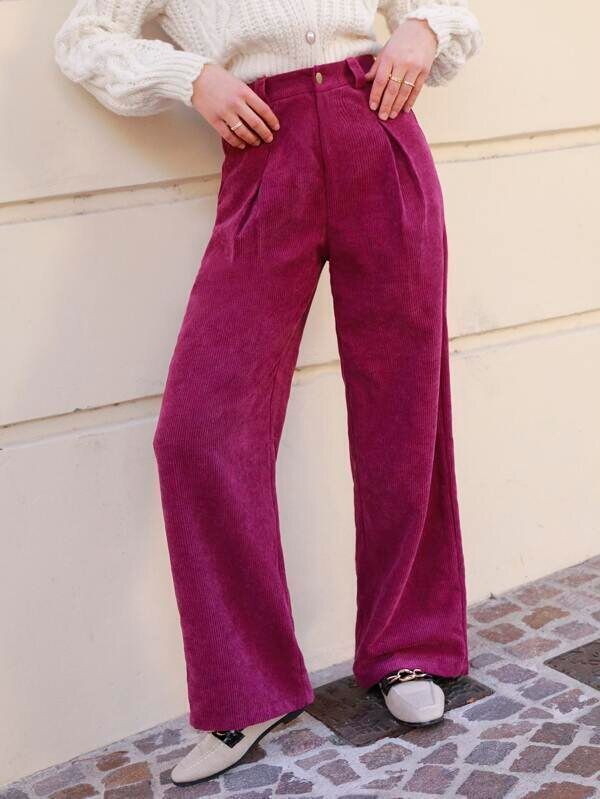ピンクのハイウェストコーデュロイパンツ。白いトップスと合わせると、全体がかわいらしくすっきり見えます。ハイウエストのパンツはトップスなので、ブラウジングをして着こなすのがおすすめです。