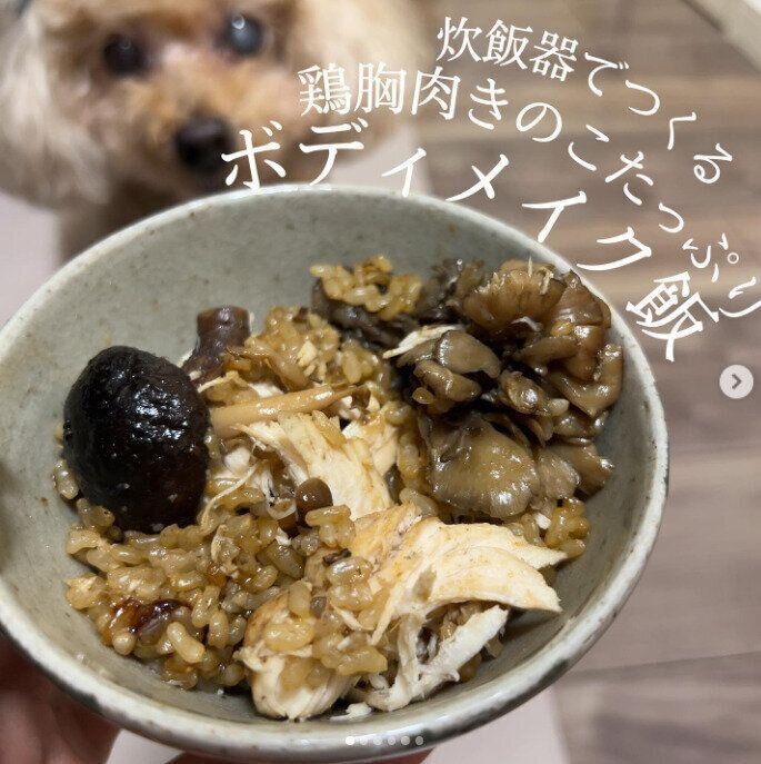 おいしいものを食べたいから、材料や調理方法を工夫したヘルシーごはんで食事を楽しみます。こちらはその名も「ボディメイク飯」。ご本人も「おいしすぎた!」という、炊飯器でつくる炊き込みごはんです。