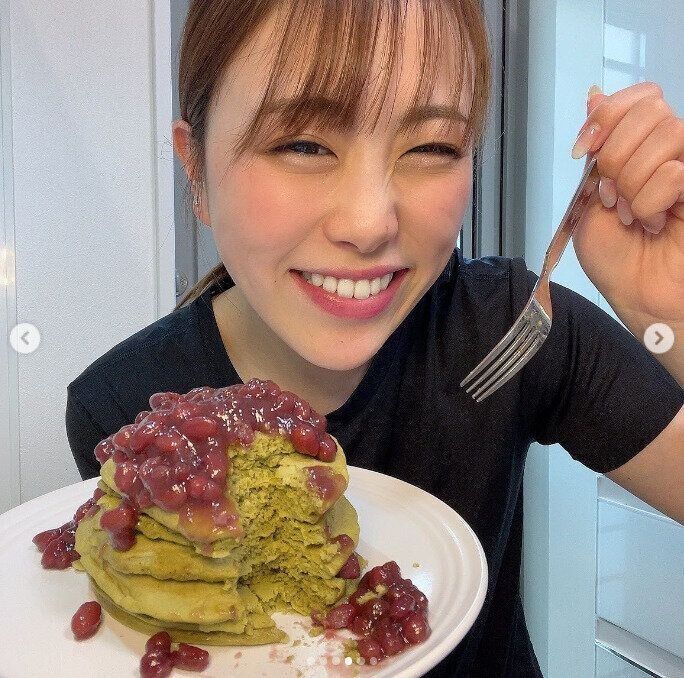 いっぱい動いたから、スイーツも楽しもう!こちらはオートミール粉でつくるダイエットスイーツです。つくりかたも簡単。オートミール粉50g、豆乳90g、卵1個、ラカント15g、ベーキングパウダー3g、抹茶粉5gを混ぜてフライパンで焼けばできあがり。トッピングにあずきをのせて完成です。