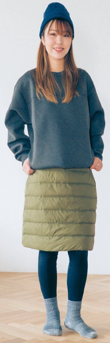 「ダブルフェイスビッグシルエットプルオーバー」(チャコール杢)¥1,280、「洗えるフュージョンダウンスカート」(カーキ)¥1,500、「ウィンドシールドボルカレギンス」¥980、「シンサレートビーニー」(ネイビー)¥399