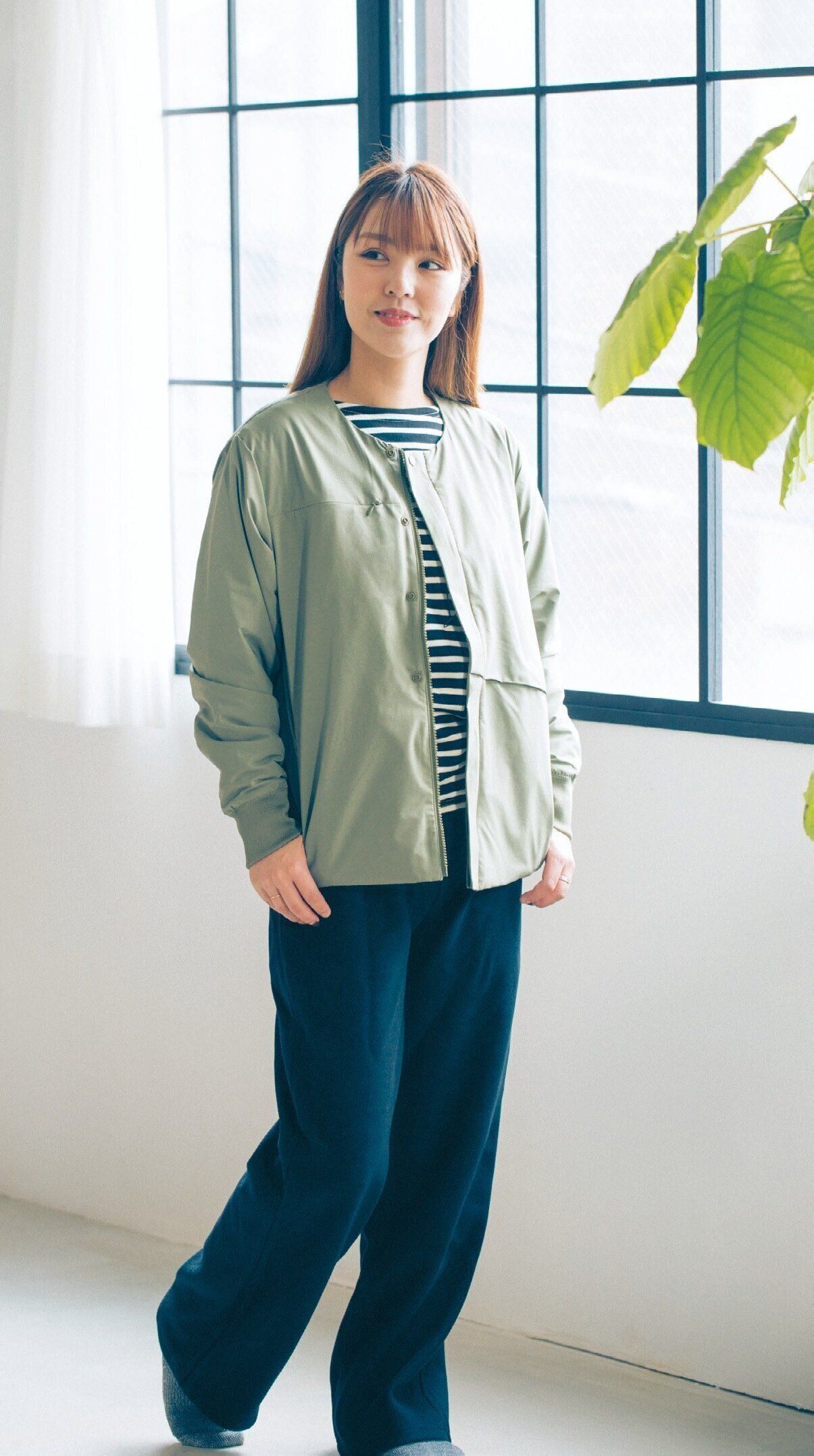 ほどよい厚みで保温効果もあるアウターは、ライトな着心地で室内でも◎。裏地の付いたプルオーバーと厚手のパンツで、防寒対策完璧!