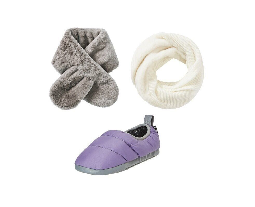(左上)「フェイクファーティペット」¥780、(右上) 「フェイクファー切り替えニットスヌード」¥980、「Heyaルームシューズ」(ラベンダー)¥980、(下) 「レディースアンゴラウールルーズソックス」(1足)各¥199