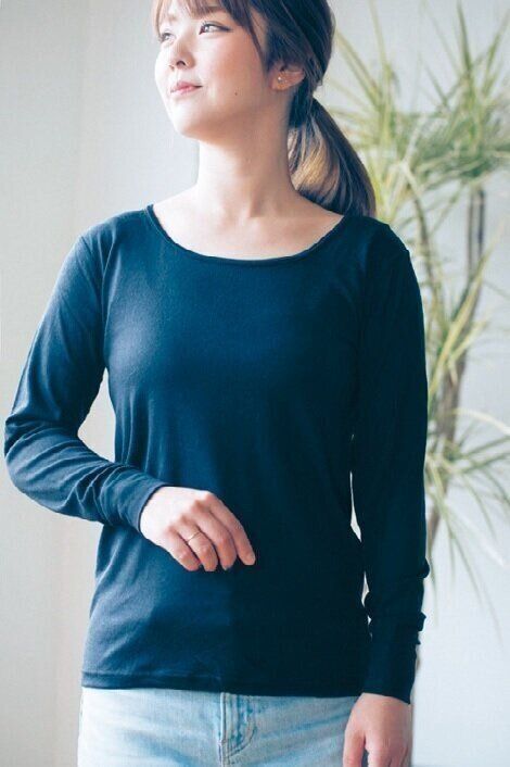 上質なウールの優れた保温性と伸縮性で、ちくちく感もなし。襟ぐりが広めなのもうれしい。
