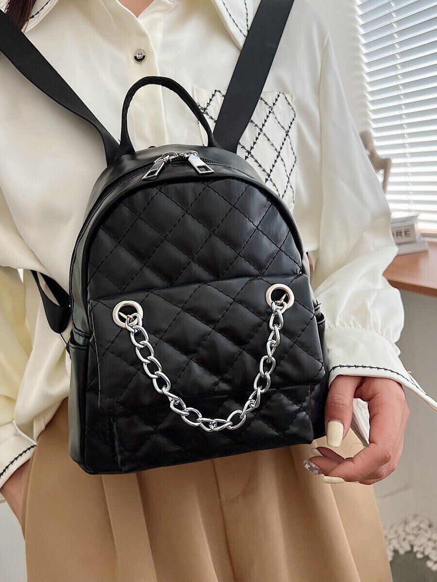 ナイロン素材のリュックとチェック柄スカートのコーデです。清潔感のある白トップスに、チェック柄のスカートを組み合わせることで大人のキレイめな着こなしになります!