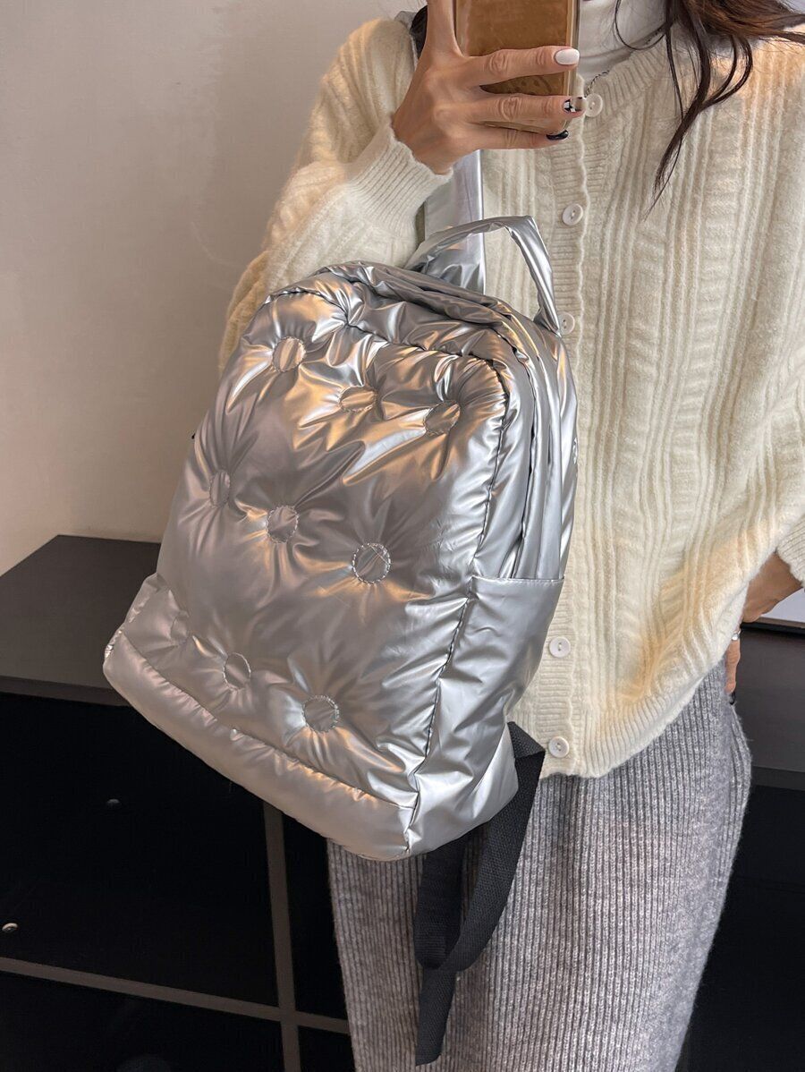 淡いトーンでまとめるなら、シルバーカラーのリュックを