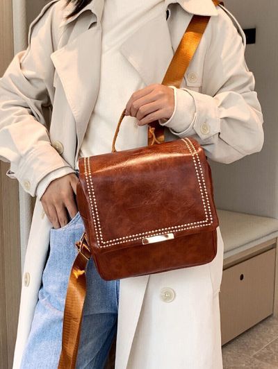 PUレザー素材のリュックとトレンチコートのコーデです。ベーシックなトップスとジーンズの組み合わせに、トレンチコートを足すことで大人クールな印象になります!