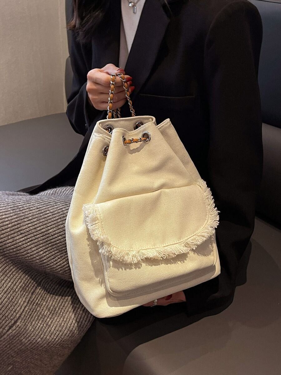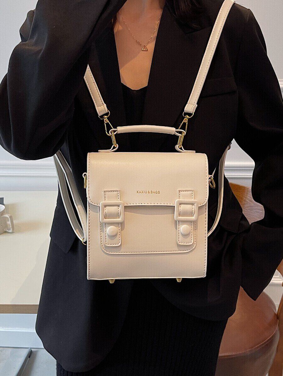 PUレザー素材のリュックとベージュのボトムスコーデです。ベージュのワイドパンツに、白シャツをインすることで脚長効果が期待できます!また、黒リュックを組み合わせることでコーデが締まります。