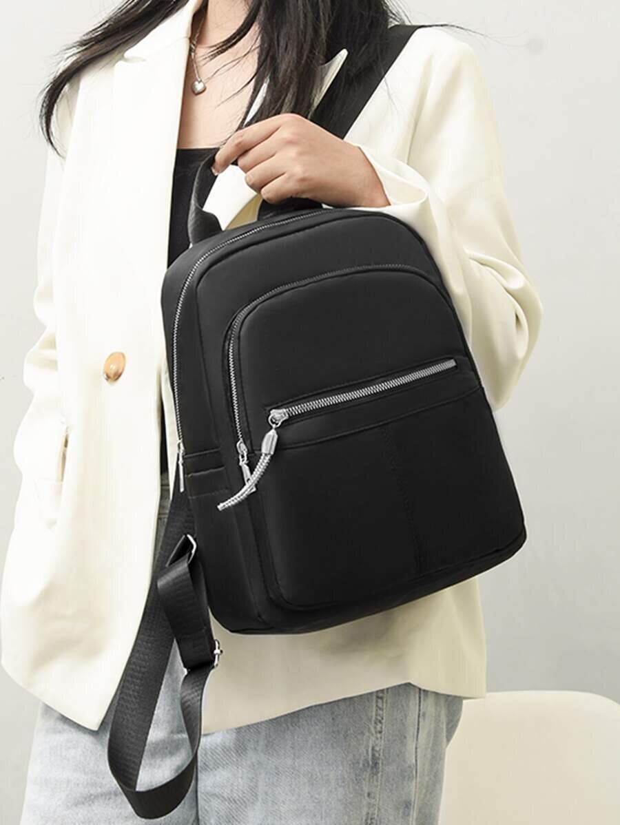 淡いトーンのファッションには、黒リュックで全体を引き締めて