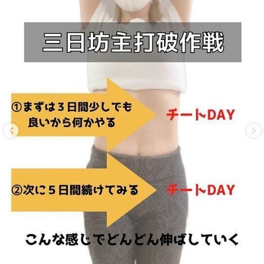 その名も、「三日坊主打破作戦」。tuna.diet153さんは、自宅トレーニングなど、ダイエットを少しでもがんばることができたら、「チートデイ(ダイエット中にもうける好きなものを食べてよい日)」、いわゆる「ごほうび」をくっつけることで、やる気を継続するという方法を取り入れてみました。はじめは、「3日間続けてみる→チートデイ」。次に「5日間続けてみる→チートデイ」といったように、どんどん伸ばしていくことで自分を奮い立たせていったのです。