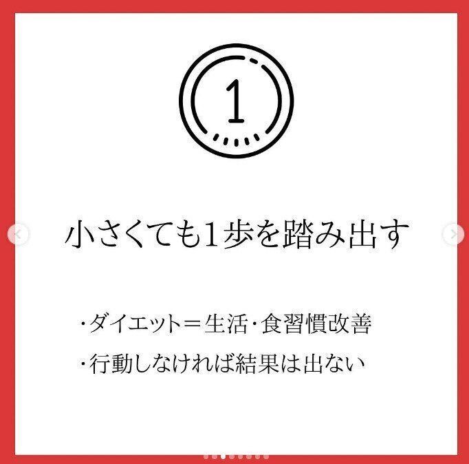 ダイエットとは、「今の生活と食習慣を改善すること」だといいます。今の生活や食習慣で太ってしまったのです。これらを変える行動をしなければ、なにも変わらないのです。まずは「小さくても1歩ふみだしましょう」とbona_kana.0201さんはいいます。