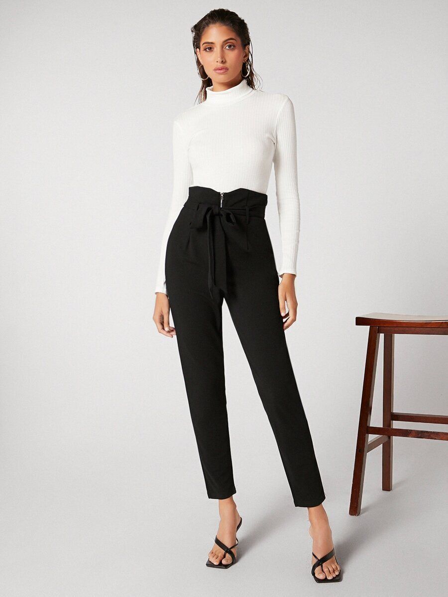 ハイウエストの黒スキニーパンツに、白トップスを組み合わせたコーデです。ウエストをマークするリボンがあることで、お腹周りをカバーします!