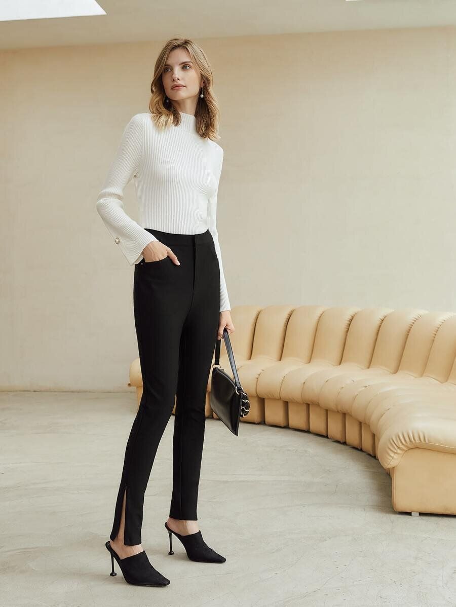 裾のスリットがポイントの黒スキニーパンツに、白トップスを組み合わせたコーデです。裾のスリットから見える素肌で抜け感ができ、美脚効果が期待できます!