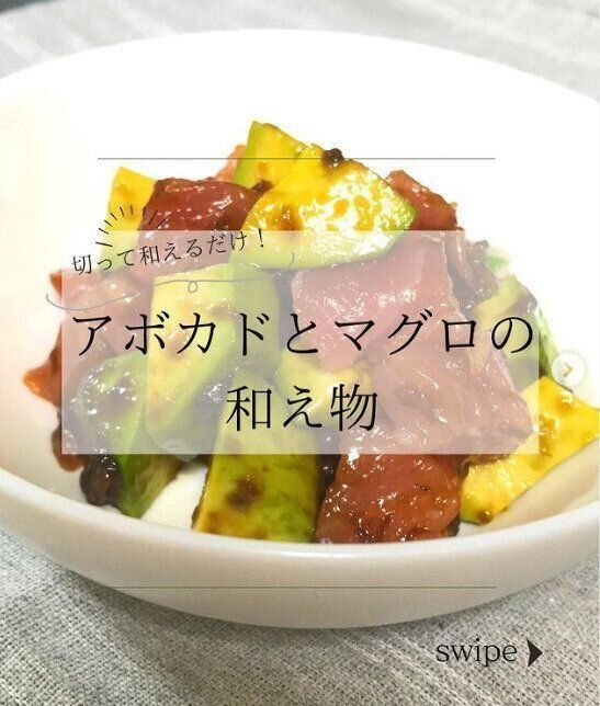 次は、食物繊維たっぷりのアボガドをつかった「アボガドとマグロの和え物」を教えてもらいましょう。刺身用のマグロ100gとアボガド1個をひとくち大に切り、ノリの佃煮大さじ1.5杯をあえればできあがり!こちらは切って混ぜるだけで完成。おいしい副菜があっという間にできあがりますね。