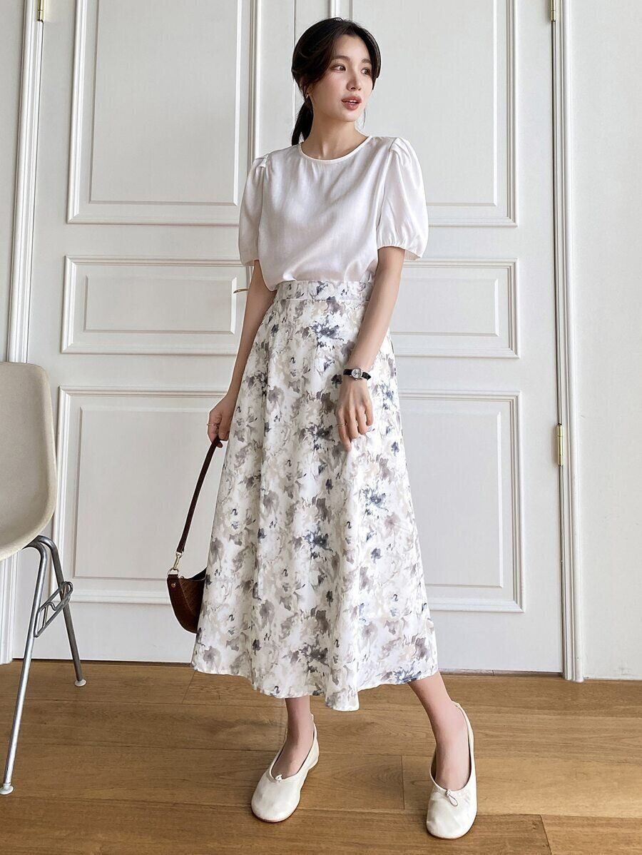 女性らしいホワイトの配色コーデです。二の腕をカバーするパブスリーブのTシャツと、花柄スカートを合わせることで優しい印象に!フラットなバレエシューズを選ぶことで、キレイさを残しつつ動きやすいです。