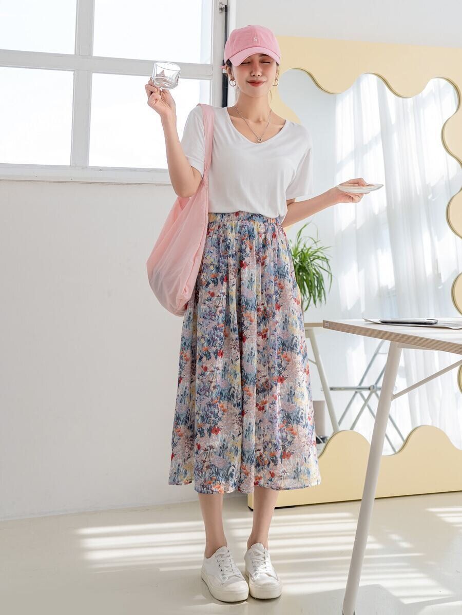 合わせやすい小花柄のスカートを使ったコーデです。キャップや厚底サンダルなどカジュアルな小物を使用していますが、全体をモノトーンにすることで大人の装いになります!