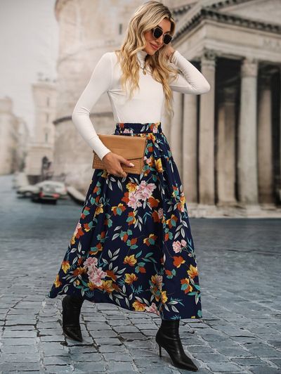 インパクトのあるロング丈の花柄スカートです。タイトな黒のロングブーツを合わせることで、エレガントな装いに!スカートにボリュームがあるため、トップスにはタイトなデザインのものを選びましょう。